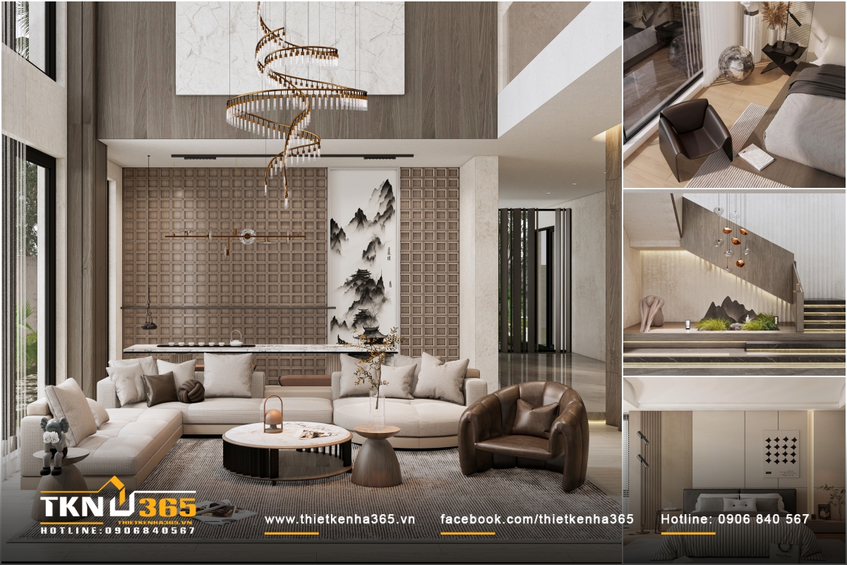 Bộ sofa lớn màu trung tính bố trí theo dạng chữ L, kết hợp bàn trà bằng đá marble tròn ở trung tâm, tạo nên sự cân bằng giữa tính tiện nghi và tính nghệ thuật. Từng chi tiết nhỏ như ghế bành da nâu, đèn thả trần xoắn mềm mại hay sự phối hợp hài hòa giữa ánh sáng tự nhiên và ánh sáng nhân tạo đều góp phần nâng tầm không gian, biến phòng khách thành nơi tiếp đón trang trọng nhưng cũng đầy gắn kết.