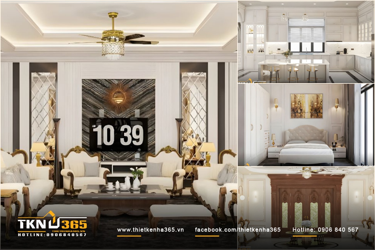 Bước qua cánh cửa gỗ chạm khắc tinh xảo, không gian bên trong biệt thự mở ra như một bản giao hưởng giữa vẻ đẹp tân cổ điển và sự ấm cúng của một tổ ấm gia đình. Trần cao kết hợp cùng đèn chùm pha lê lộng lẫy, ánh sáng phản chiếu lên nền đá cẩm thạch sáng bóng, làm nổi bật những đường nét trang trí tinh tế. Nội thất được chọn lựa kỹ lưỡng: chất liệu gỗ tự nhiên sơn trắng, kim loại mạ vàng, mảng tường phào chỉ thanh lịch, hòa quyện trong một không gian tinh tế, sang trọng và ấm cúng.