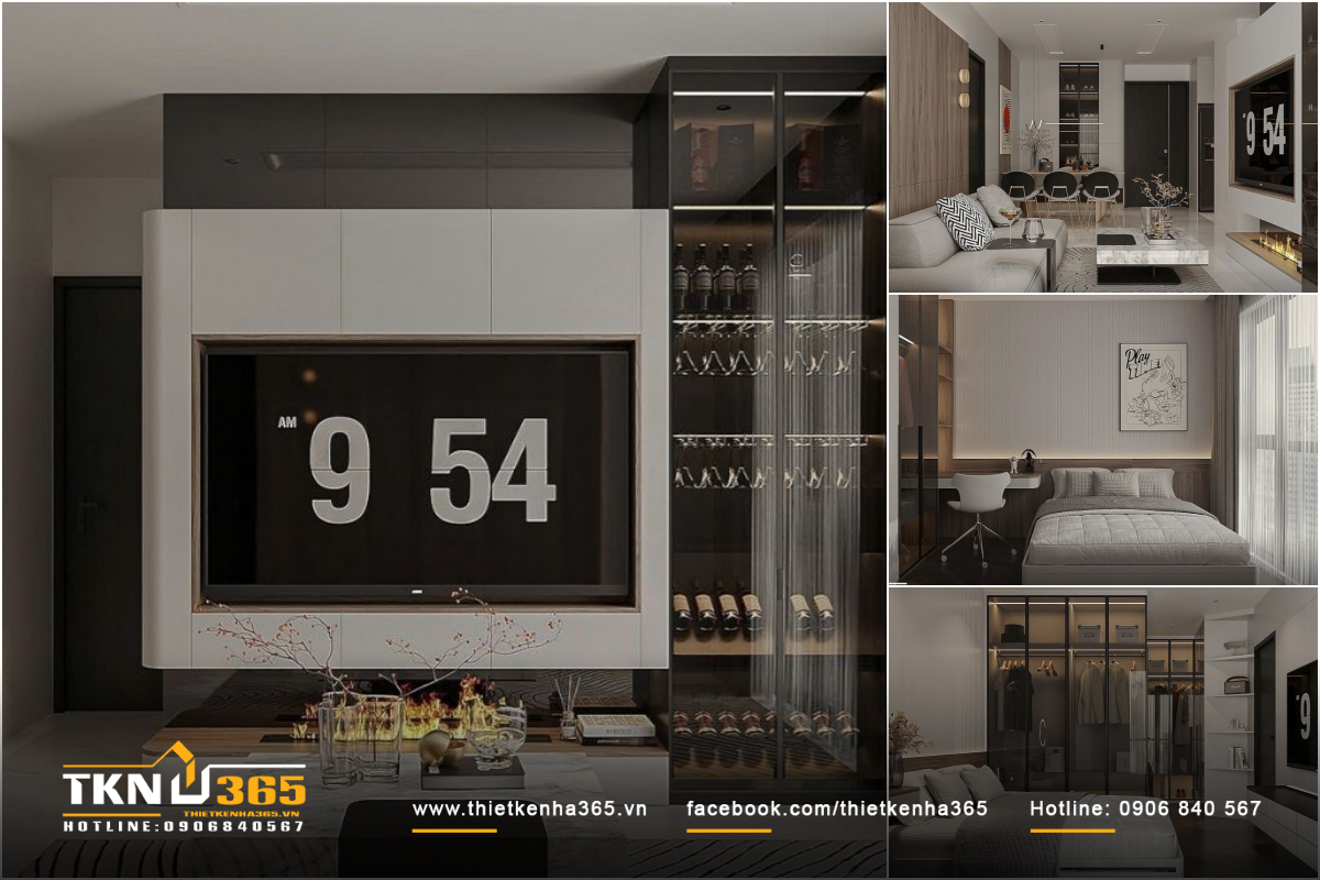 Lên các tầng trên, vật liệu chuyển dần sang gỗ nâu ấm, gợi bầu không khí thư giãn dễ chịu. Phòng ngủ master thiết kế tối giản với giường bọc nỉ, bức tường đầu giường ốp gỗ veneer. Hệ tủ quần áo bằng kính trong suốt tạo chiều sâu thị giác, giúp không gian trở nên nhẹ nhàng mà vẫn sang trọng. Phòng ngủ nhỏ của bé tươi sáng hơn nhờ gam màu trắng và be, bàn học liền tủ và tranh trang trí sinh động, tràn đầy năng lượng.