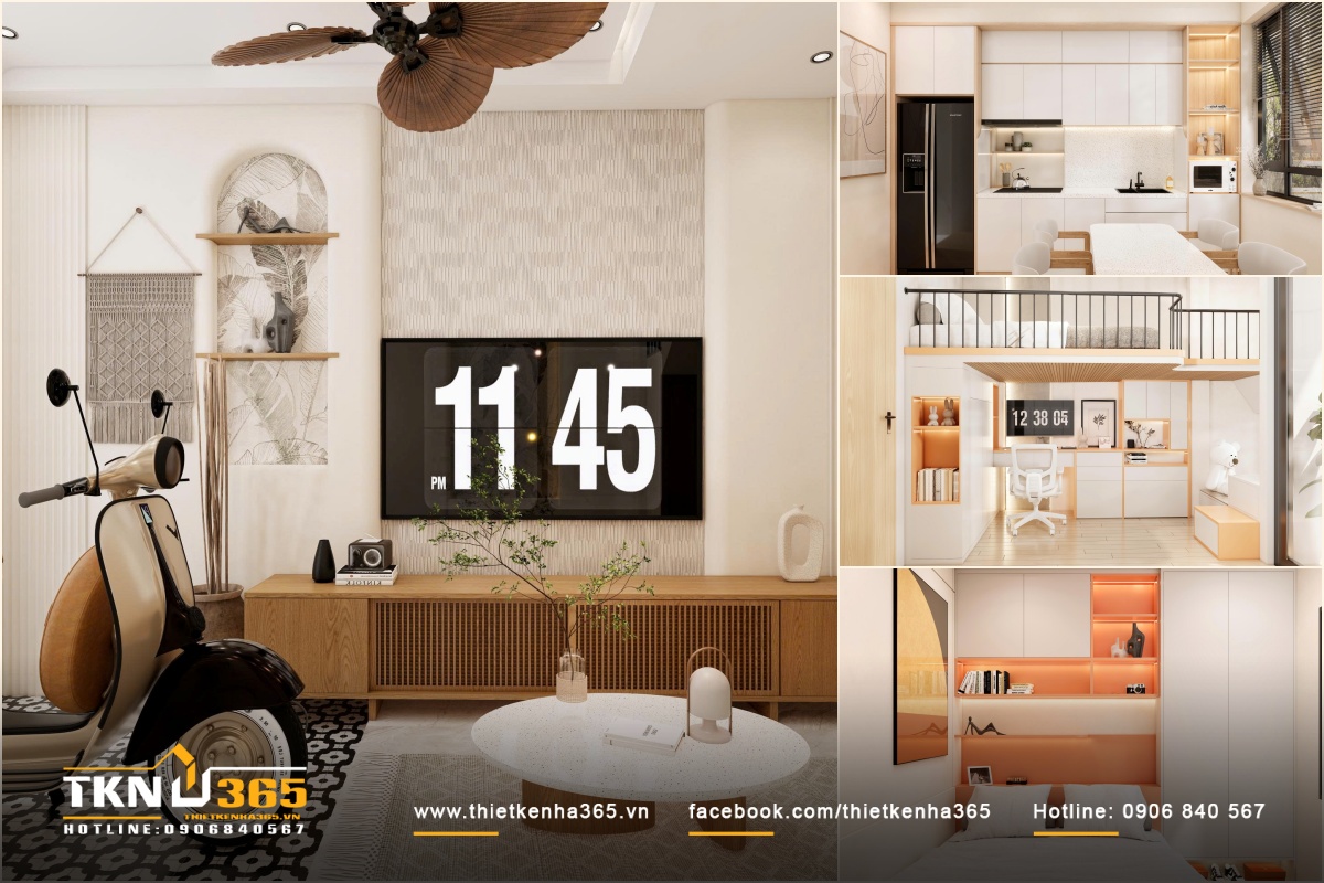 - Tầng lửng: Sảnh thang, phòng bếp – ăn, 1 phòng ngủ