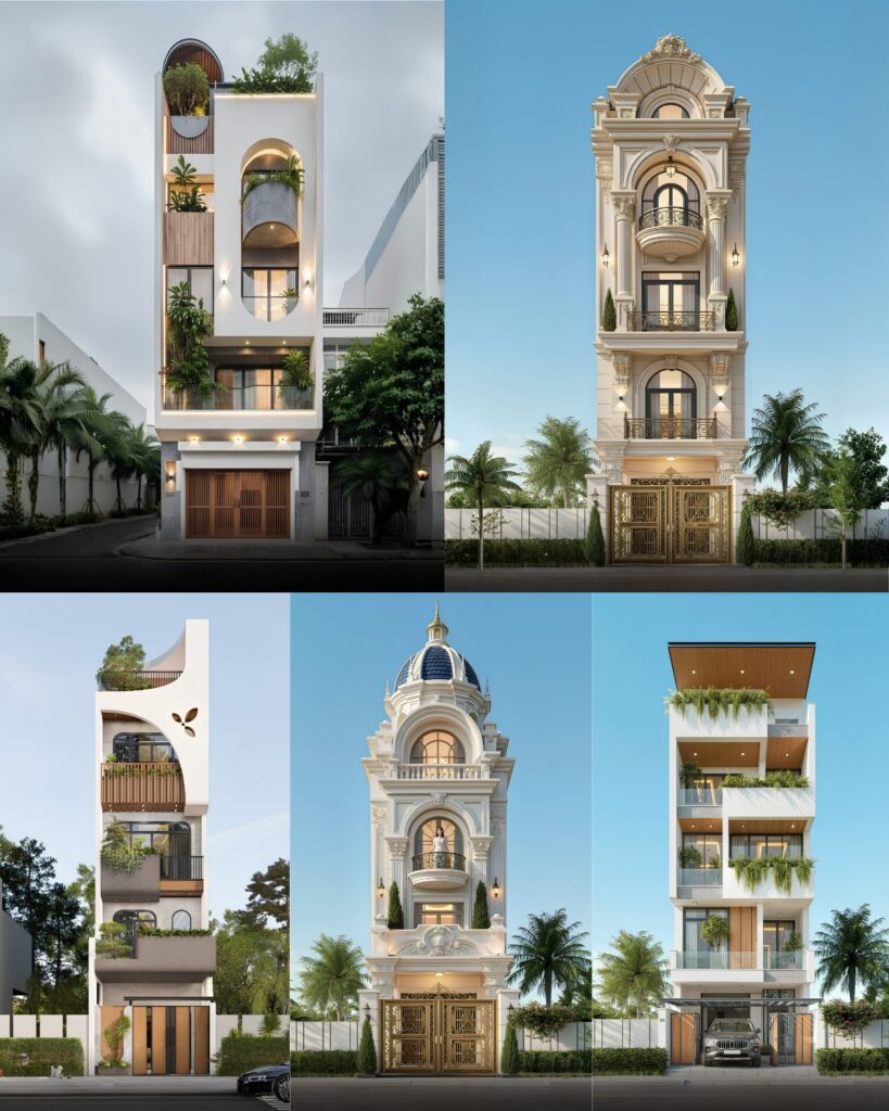 Chúng tôi có sẵn các mẫu thiết kế nhà 1 trệt 4 lầu với đa dạng phong cách: Hiện đại, Tân cổ điển và Cổ điển. Tập trung tối ưu không gian sống, đáp ứng nhu cầu sinh hoạt. Khéo léo thể hiện gu thẩm mỹ riêng của gia chủ.