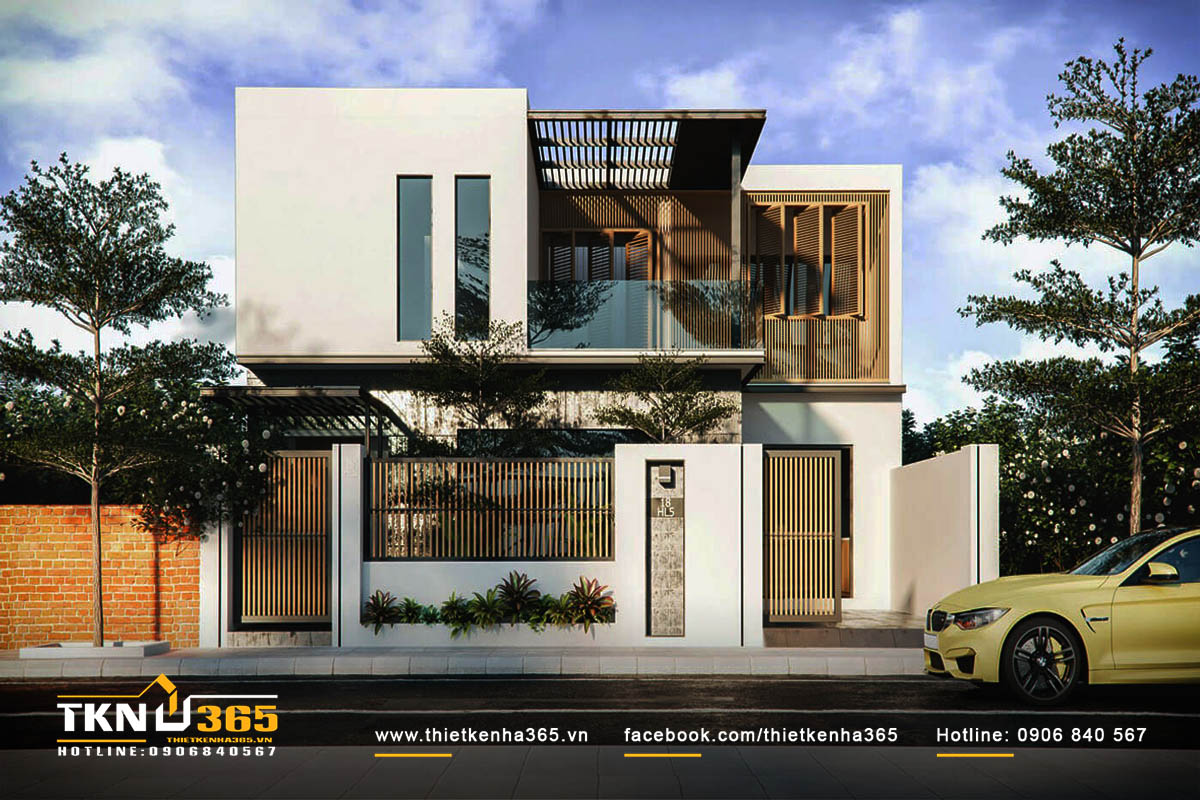 Mẫu nhà có tầng tum hiện nay đang rất được ưa chuộng bởi thiết kế độc đáo và không gian thoáng mát, rộng rãi. Lựa chọn chất liệu gỗ không chỉ mang đến cảm giác ấm cúng mà còn tạo sự bền bỉ và vững chắc cho toàn bộ căn nhà. Sân trước có kích thước lớn dùng để làm gara.